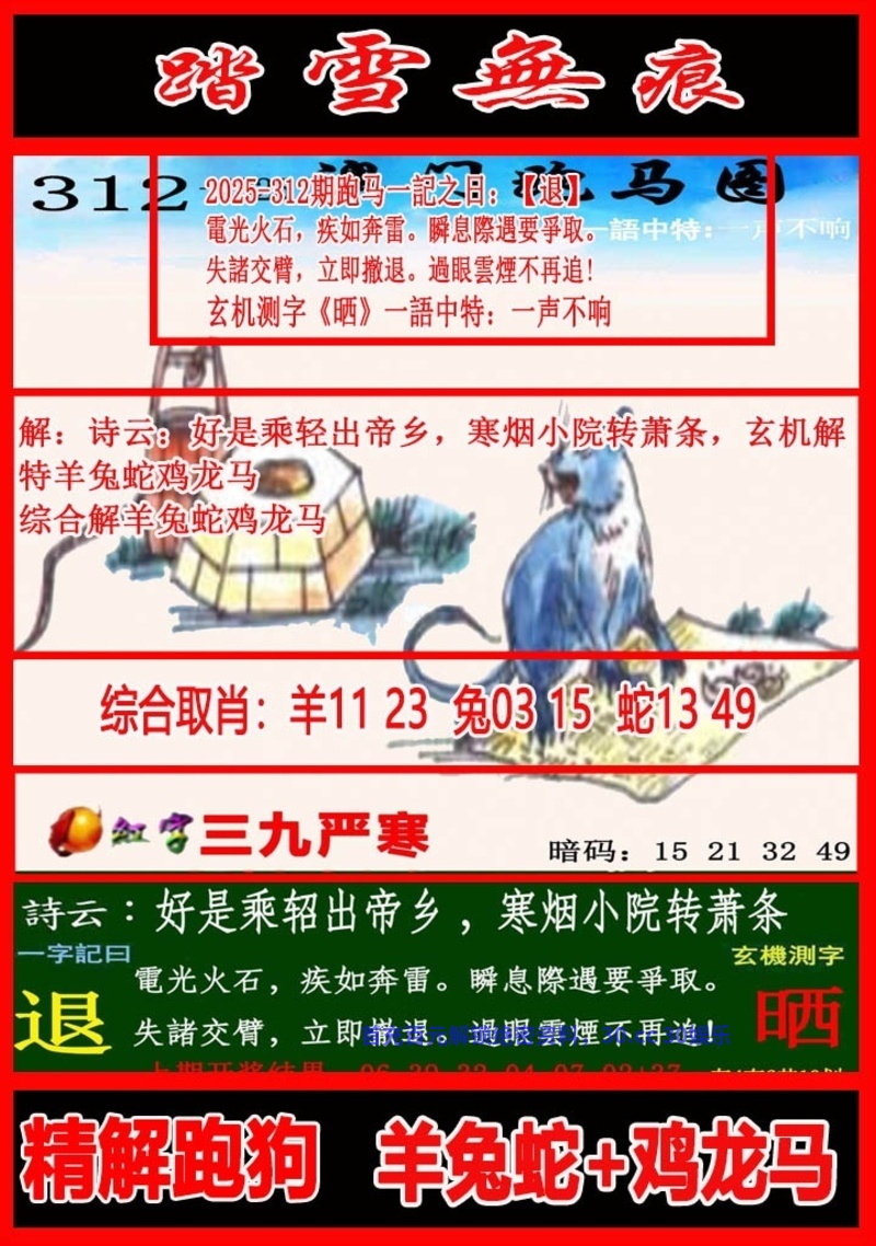 308期【虎鼠猴龙马牛羊鸡】开:兔39准